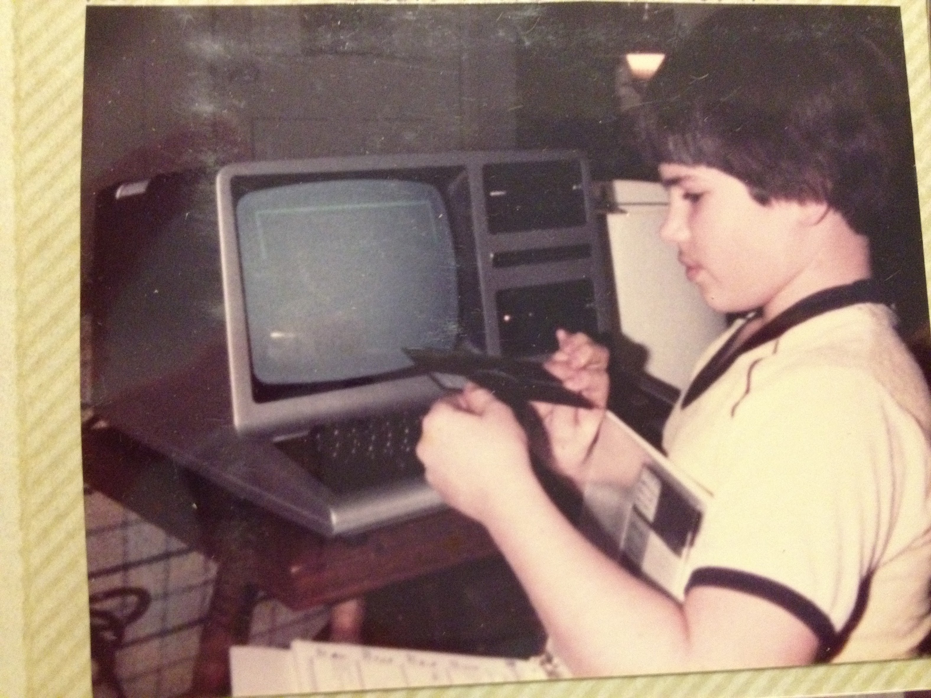 I don’t think I have a picture of me with the old Model I, but here I am with the model III a year later (it stored programs on a floppy disk, which I’m holding). I know this is during the winter time also because I’m still in my Pittsburgh Steelers pyjamas that I got for Christmas.
