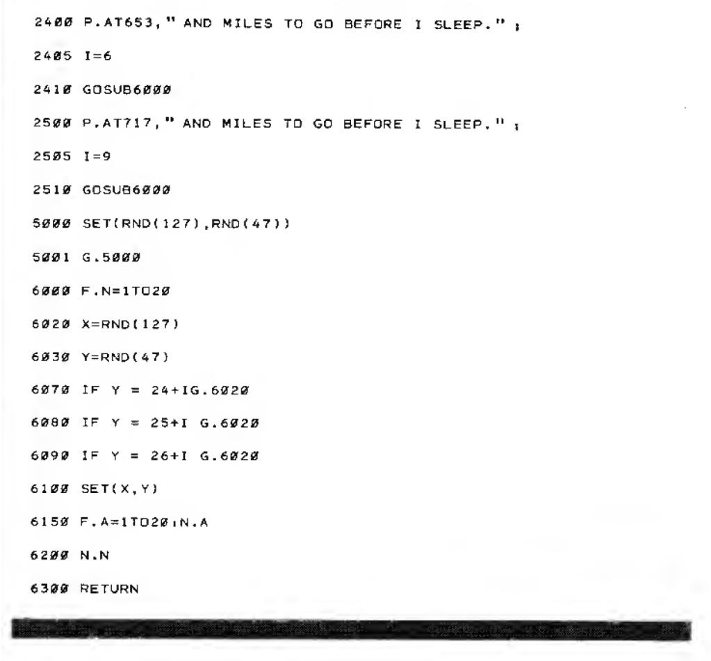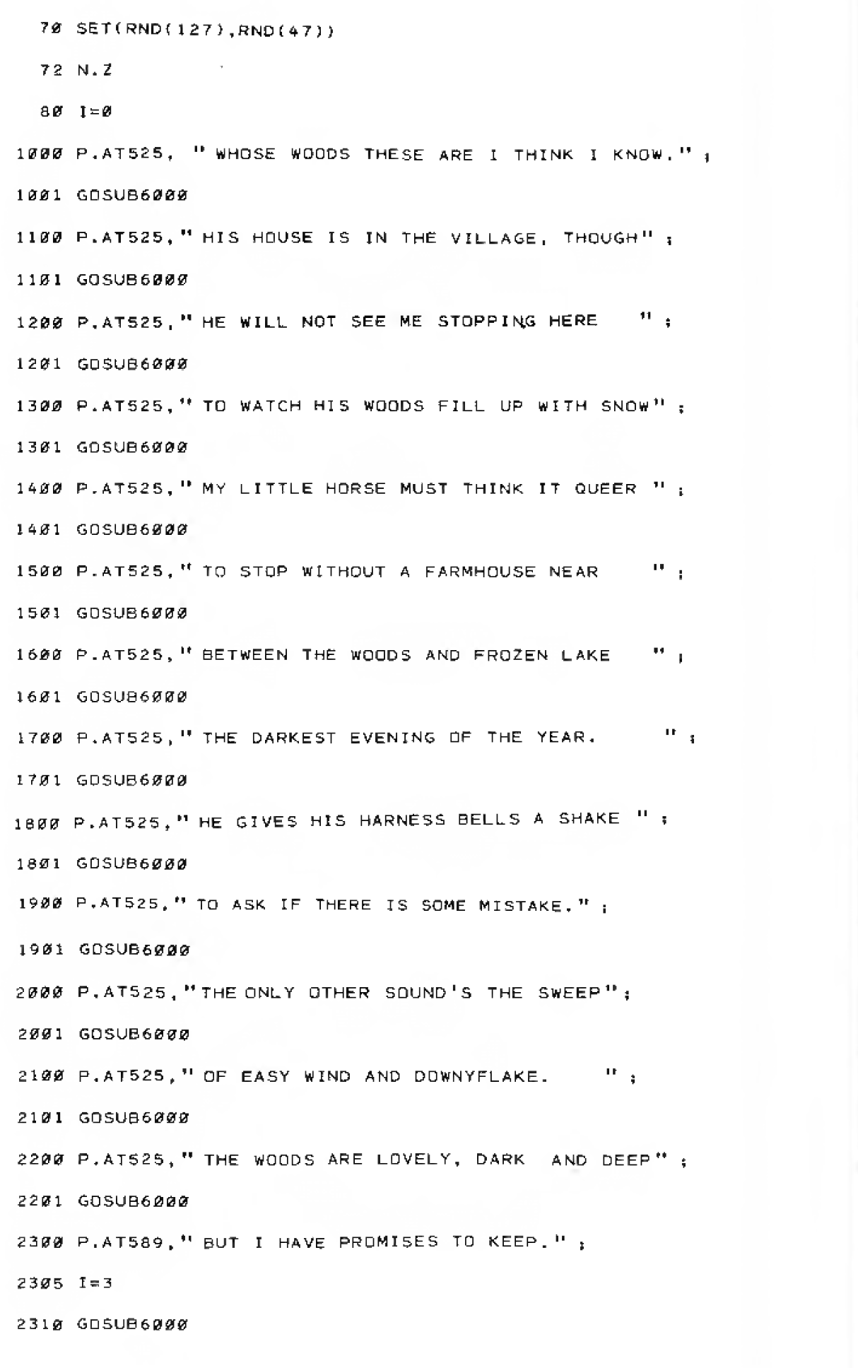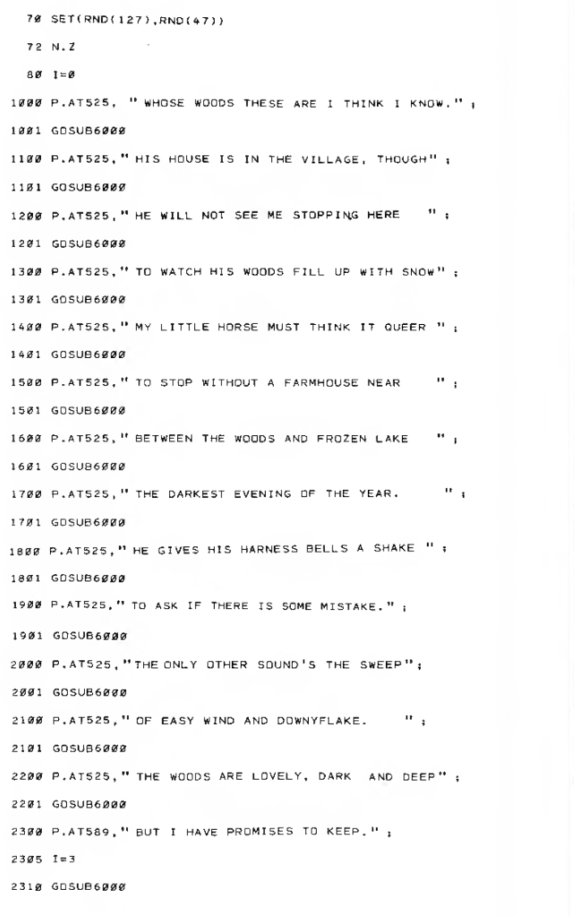 Each line of the poem is listed separately, and after each line, a command sends things to a subroutine (GOTOSUB6000) to generate random snow, which then sends it back to where it came from (RETURN). Open the screenshot below to see.